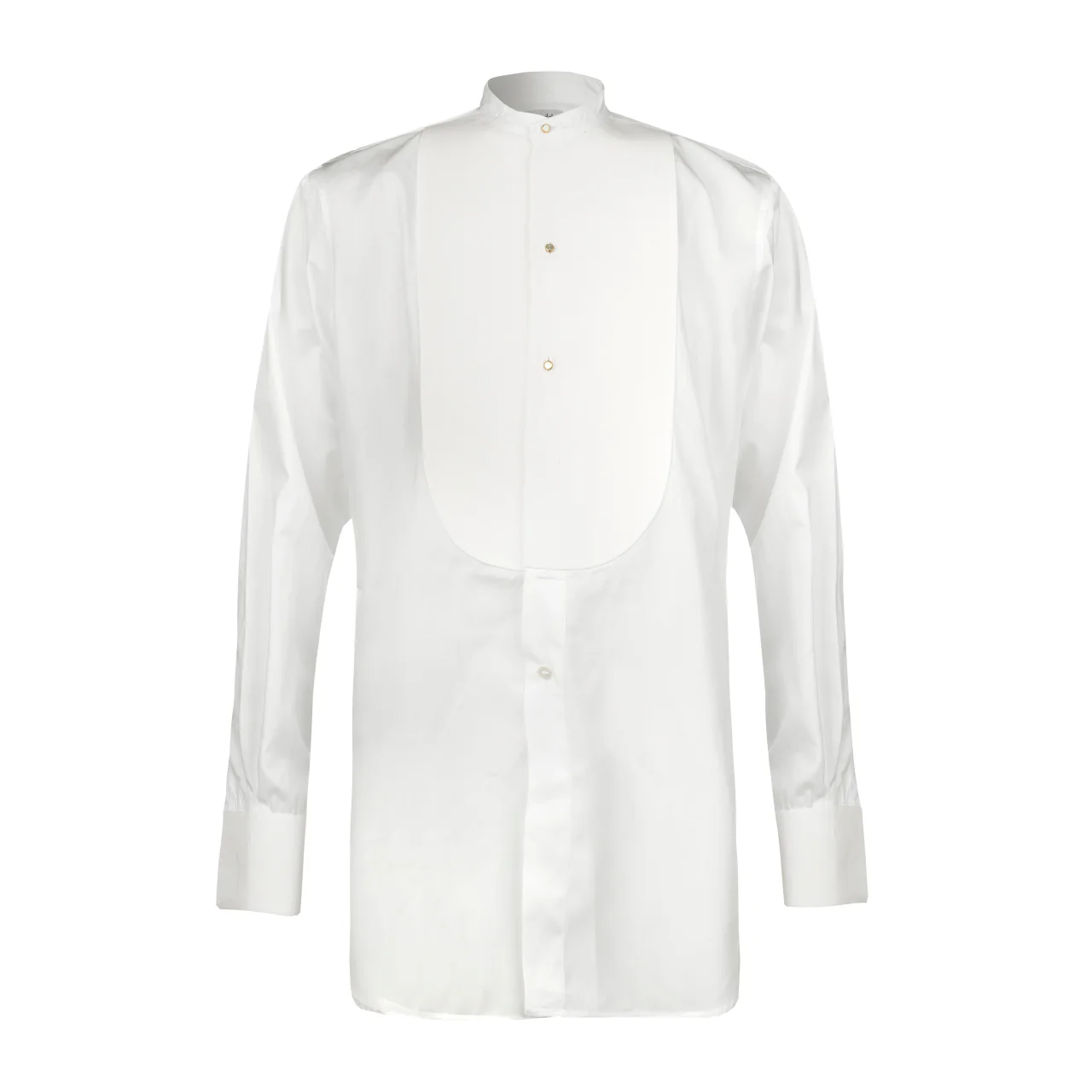 A traditional stiff bib shirt for White tie wear. This shirt should be worn with a starched collar as well as dress and collar studs, white bow and vest. This shirt has all the hallmarks required of a traditional White tie shirt and has been a top seller at Budd since day one. When selecting your detachable collar, be advised that you should select a size larger than the shirt itself.