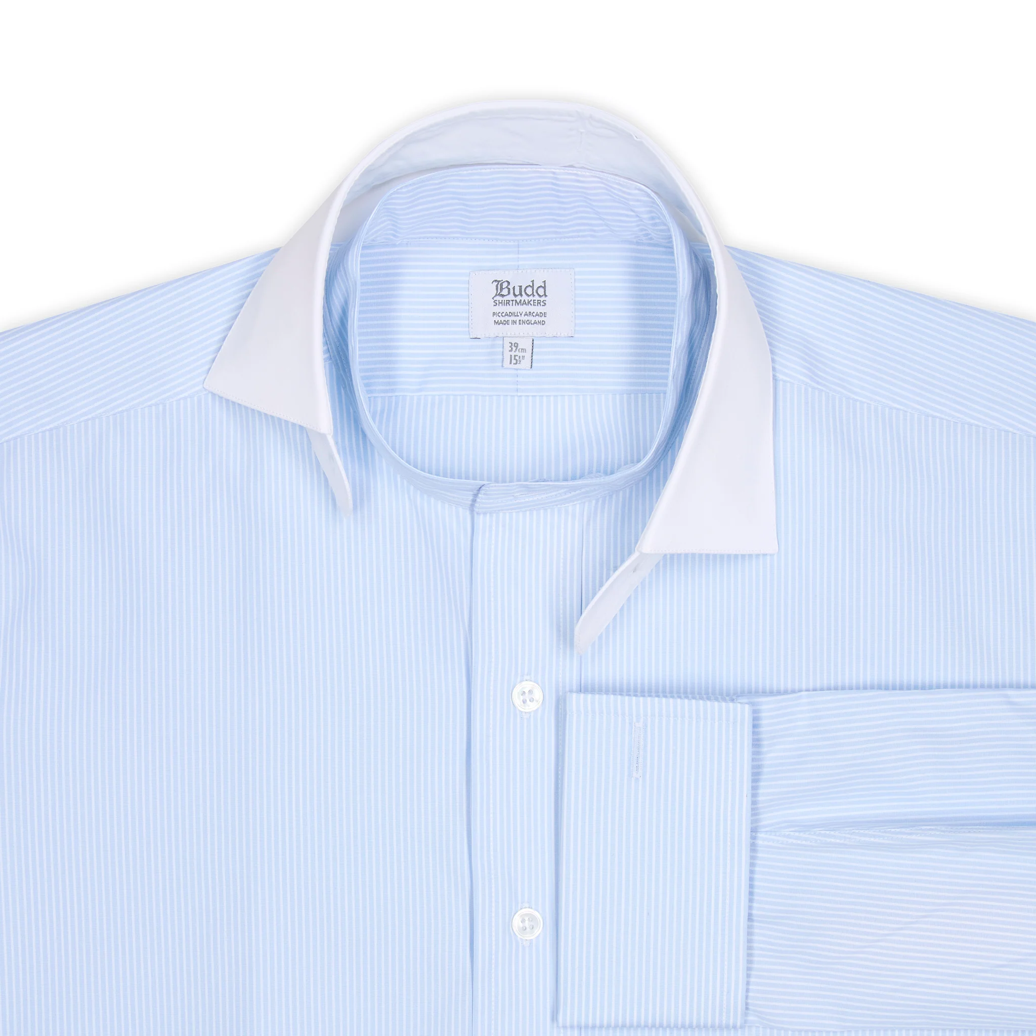 A pretty neckband shirt in a sky blue and white pencil stripe design. Cut to Budd's Classic Fit.
